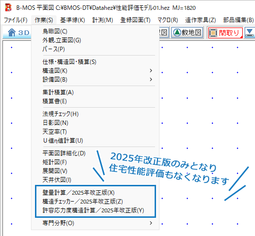 バージョンアップが終わると、デスクトップに複製B-MOSを起動する[B-MOS2025(クローン)]ショートカットフォルダが作成されます。 《 B-MOS物件センター 》から《 平面図 》を起動すると、作業メニューから住宅性能評価や旧基準版のプログラムをご利用いただけます。