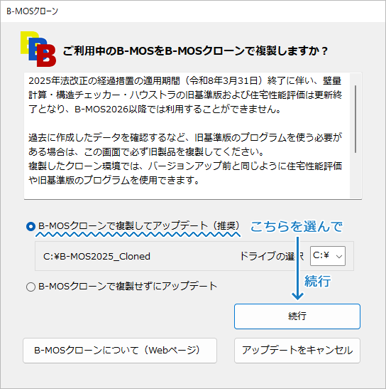 「B-MOSクローンで複製してアップデート(推奨)」を選択して「続行」をクリックすると、B-MOSの複製がはじまります。 B-MOSの複製が終わると、ネットアップデート画面に戻るので、バージョンアップを完了してください。